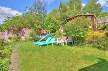 To the rear is a stunning tiered garden with something different on each level from a patio area, fruit trees, lawn, plants, wooden sheds and a summer house.