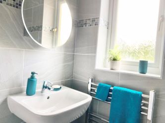 Fully refurbished with a modern white three piece suite comprising a double shower with wall mounted thermostatic mixer shower and wall seat, a modern pedestal wash hand basin with filter mixer tap and a low-level flush WC. Full ceramic tiled surround, vinyl floor, wall mounted chrome effect ladder radiator, wall mounted vanity mirror with concealed storage and opaque double glazed window to the rear.