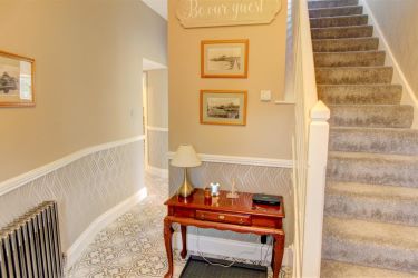 The main bathroom continues with the period theme with its large white bath with Victorian style chrome taps, a close coupled WC and a pedestal wash hand basin both in a Heritage style. In addition, there is a corner shower cubicle with wet walling within and a chrome heated towel rail. Two of the walls have been tiled and there is also a delightful shaped ceiling and a window to the rear for natural light.