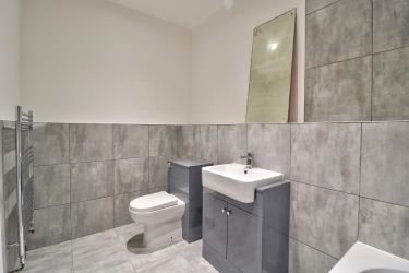 Bathroom - A three piece suite comprising of low flush WC, pedestal wash hand basin and panelled bath with mains fed shower over. Tiled flooring, heated chrome towel radiator.