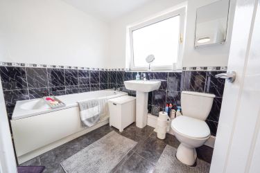 uPVC frosted window to rear, WC, Panelled bath, Corner shower, Pedestal hand & wash basin and Radiator.