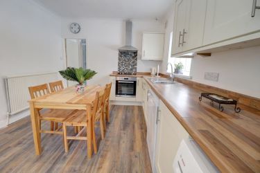 Dining Kitchen - Fitted with a range of modern matching wall and base units with complementary work surfaces, sink with mixer tap, integral oven, hob and extraction hood, tiled to complement, space for appliances, fitted storage cupboard, wooden effect flooring, radiator, one uPVC double glazed window and one small wooden double glazed window to the rear and one uPVC double glazed window and door to the side. 3.1m x 4.7m.