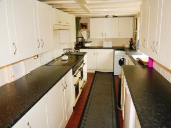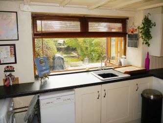 Fitted with a matching range of base and eye level units with worktop space over, china sink unit with stainless steel swan neck mixer tap, plumbing for automatic washing machine and dishwasher, built-in cooker range, double glazed window to rear with deep window sill, quarry tiled flooring, door to:
