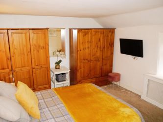 Two double glazed windows to front, open fire with wooden surround and cast- iron back, radiator, fitted carpet, TV point, dado rail, part wood panelled walls, ceiling with feature beams.