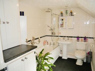 Fitted with three piece suite comprising panelled bath with independent shower over, matching telephone style mixer tap and folding glass screen, pedestal wash hand basin and low-level WC, extensive ceramic and tiling to all walls, heated towel rail, opaque double glazed window to rear, built-in cupboards housing gas combination boiler serving heating system and domestic hot water with heating timer control., fitted carpet with recessed ceiling spotlights,