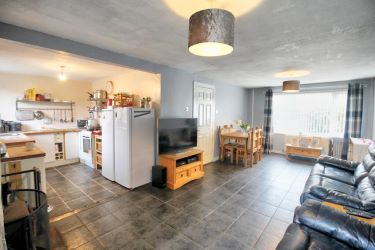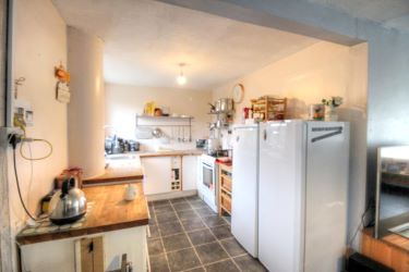 Entrance hallway with tiled floor, stairs to the first floor, door to the utility cloak room, with W/C , wash hand basin and space for a washer and dryer. Door through to the spacious bright open plan living area, with tiled floor, log burning stove and french doors leading to the rear garden. The kitchen has a range of base units with wood block work tops.