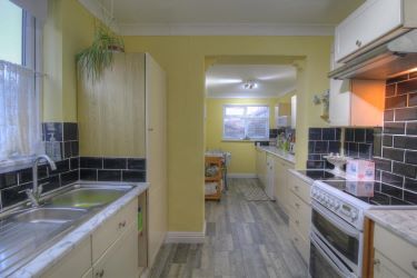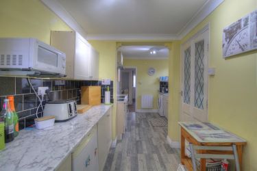 Kitchen - 18'5" x 6'3" UPVC double glazed window with a rear and side aspect, fitted kitchen with a range of wall and base units, countertops, 1 1/2 bowl stainless steel sink and drainer, electric cooker with extractor fan above, plumbing for washing machine and dishwasher, electric radiator, part tiled walls, vinyl flooring.