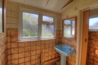 WC - UPVC double glazed window with a rear aspect, vanity wash hand basin, radiator, WC, fully tiled walls, vinyl flooring,