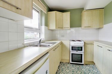 Upon entering the property, the hallway with additional good-sized storage cupboards leads to the double-aspect living room and onto a separate kitchen, which offers a mix of wall and base units, ample work surface, an electric cooker, and plumbing for a washing machine.