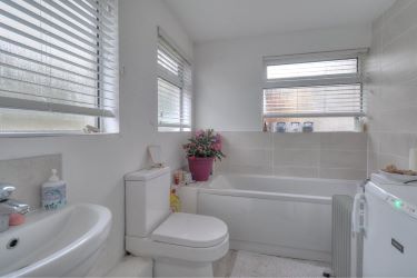 The newly fitted large family bathroom with bath and shower fitting over, sink, toilet and heated towel rail.