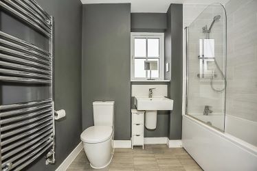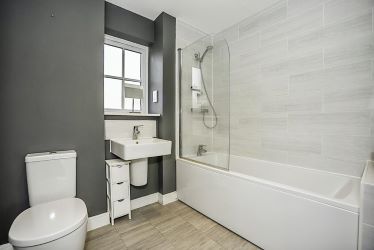 Family Bathroom: Tiled floor, double glazed window, bath with shower over and glass screen, low level wc, wall mounted wash hand basin, extractor, heated towel rail, spotlights